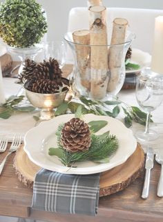 Table and tree decorations are simple making use of herbs, cones, fir and holly for a touch of greenery.
